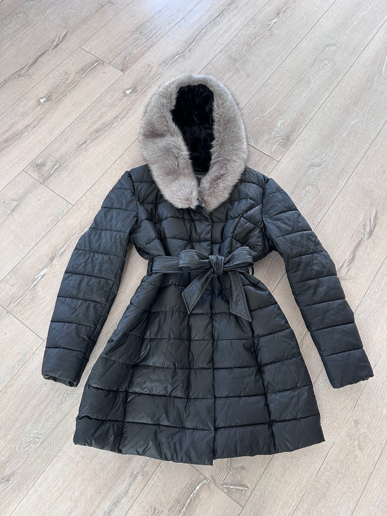 Ökobőr vízlepergető középhosszú fekete csinos télikabát fekete prémes kapucnival