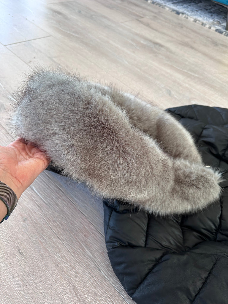 Ökobőr vízlepergető középhosszú fekete csinos télikabát fekete prémes kapucnival