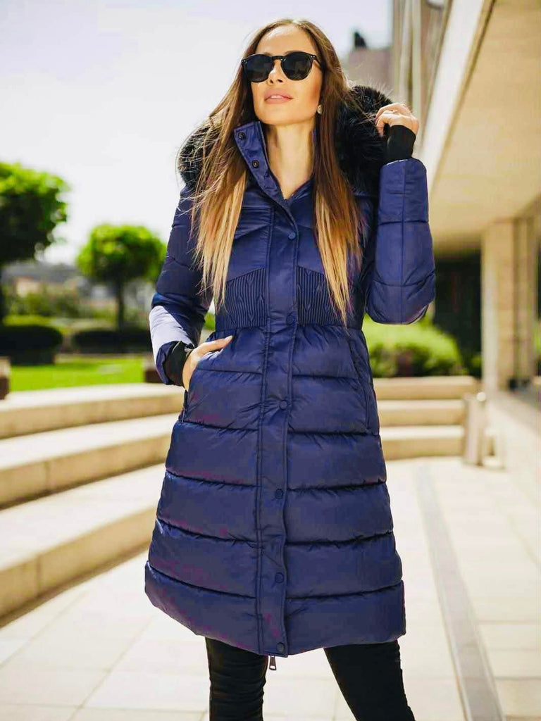 Királykék, darázsderekat csináló, meleg télikabát levehető prémmel