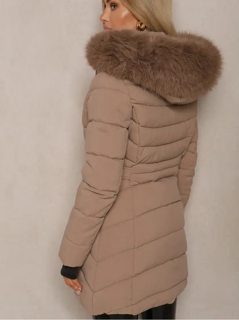 Patenttal szűkíthető, karcsúsított karamellbarna női télikabát 8907